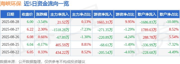 证券之星消息,截至2025年8月28日收盘,海峡环保(603817)报收于6.0元,下跌3.54%,换手率4.88%,成交量27.84万手,成交额1.67亿元。