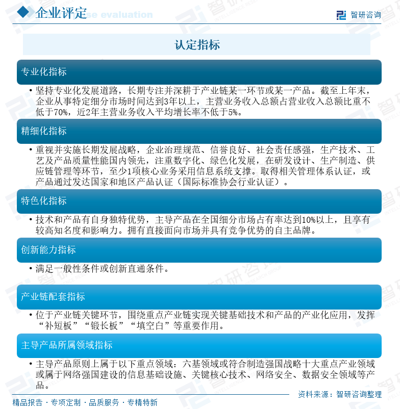 智研咨询是中国领先产业咨询机构,提供深度产业研究报告、专精特新申报服务、商业计划书、可行性研究报告及定制服务等一站式产业咨询服务。智研咨询专精特新申报服务包含:行业地位证明、品牌实力证明、销售实力证明、技术领先证明、销量排名证明、市场占有率证明、市场份额证明、经济效益评估等。