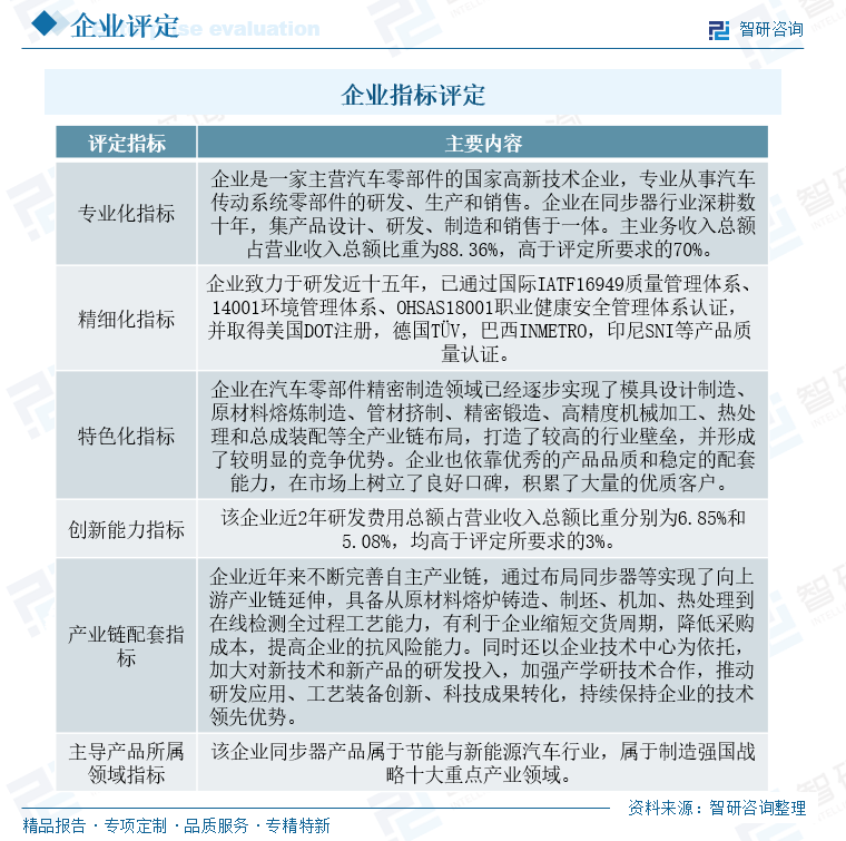 企业是一家主营汽车零部件的国家高新技术企业,专业从事汽车传动系统零部件的研发、生产和销售。企业在同步器行业深耕数十年,集产品设计、研发、制造和销售于一体。主业务收入总额占营业收入总额比重为88.36%,高于评定所要求的70%。