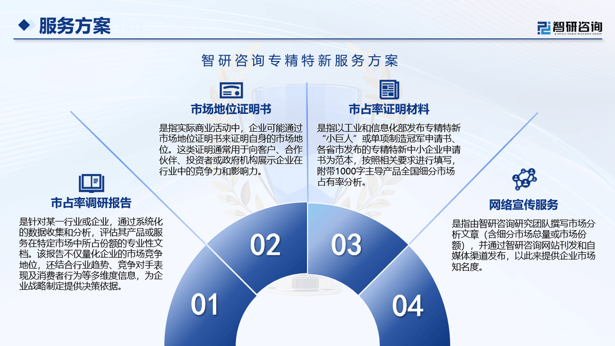 智研咨询专精特新服务方案,可出具市占率调研报告及行业地位证明材料等,权威佐证企业细分市场所占份额,助力企业专精特新申报关键一步。
