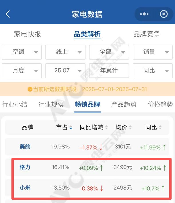 情况也很快迎来转折。格力电器市场总监朱磊晒出奥维云网同一项统计数据反击,称“我们也去奥维云网查了下,公开的数据和那几张截图并不一样。按照同样的查询条件,7月线上市场格力仍然保持领先”。